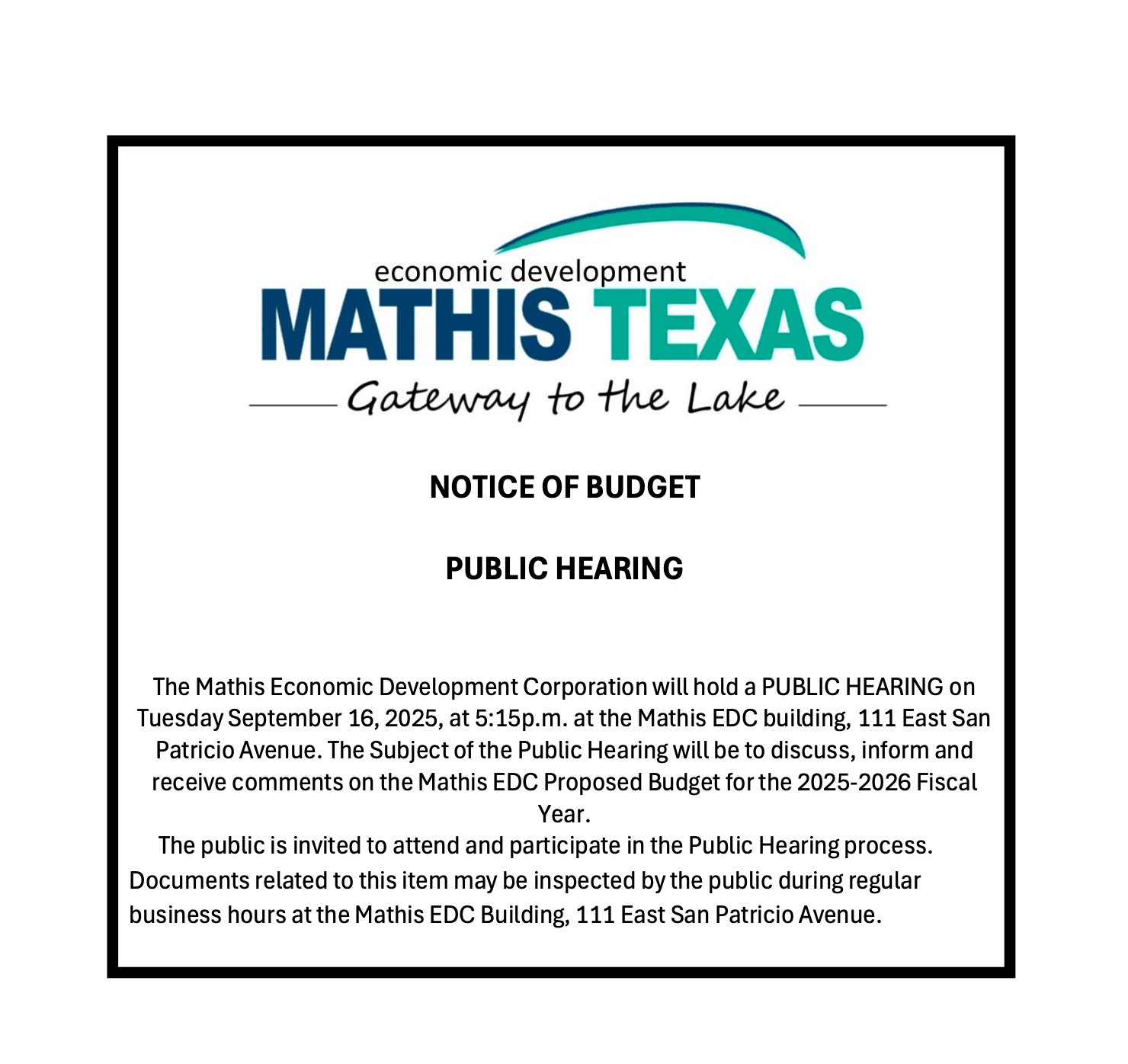 The Mathis Economic Development Corporation (EDC) will hold a Public Hearing on Tuesday, September 16, 2025, at 5:15 p.m. at the Mathis EDC Building, 111 East San Patricio Avenue.