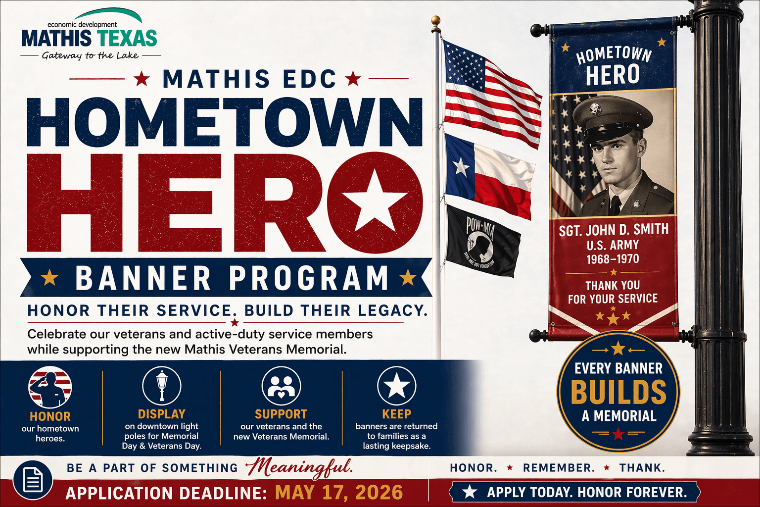The Mathis Economic Development Corporation is proud to launch the Hometown Hero Banner Program, a community-wide tribute honoring the veterans and active-duty military personnel who call Mathis home. Every banner sold contributes directly to the construction and expansion of our new Veterans Memorial — a permanent place of remembrance for the men and women who have served our nation.